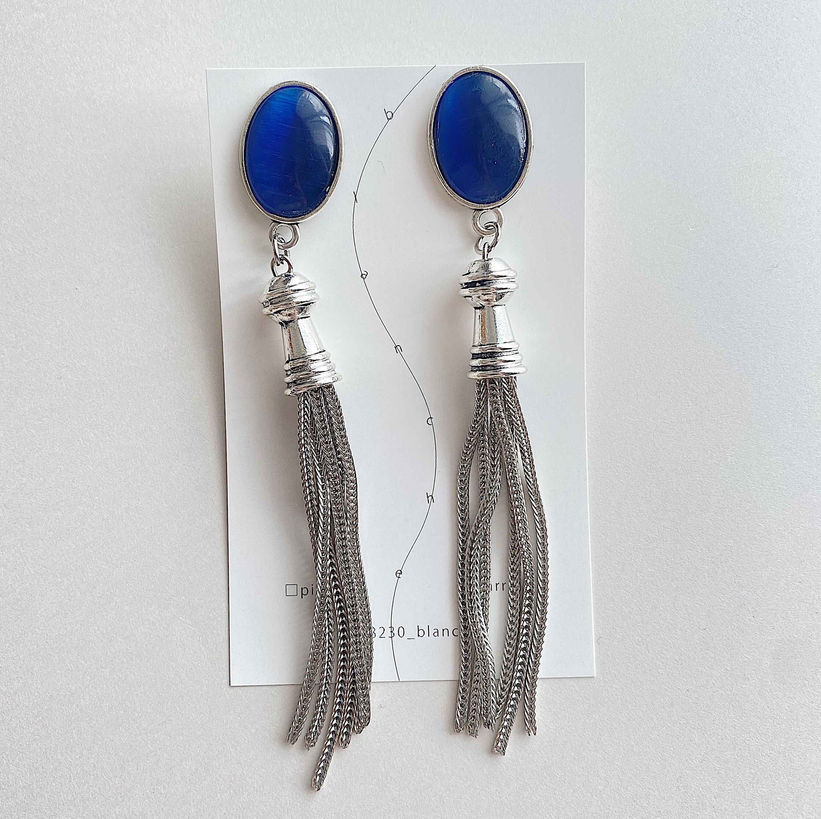 キャッツアイの綺麗な深いブルーのカボションにシルバーのタッセルを合わせました。シンプルながら存在感のある作品です。