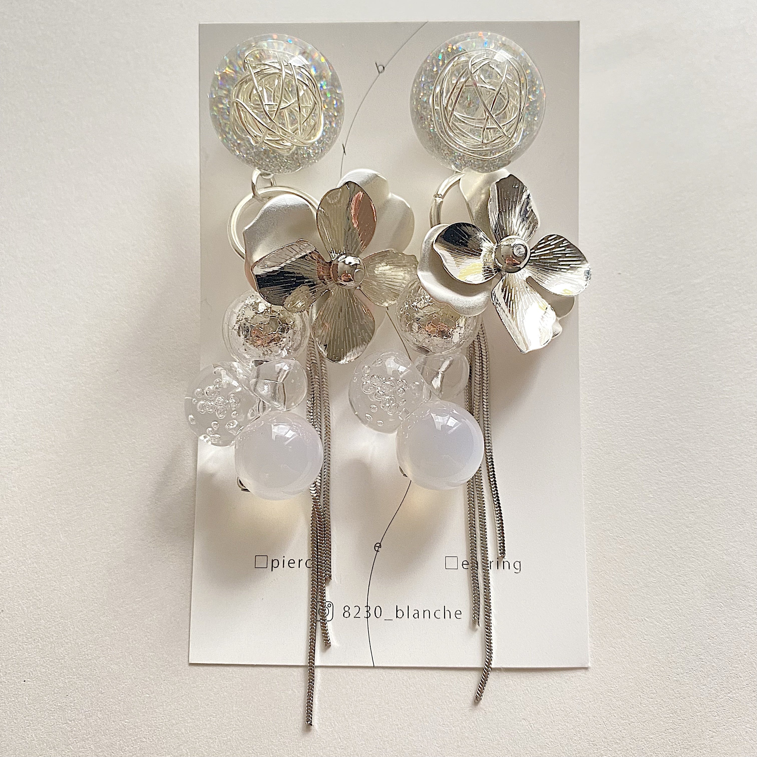 ワイヤーとラメが入ったポストにシルバーのフラワー、鈴丸を合わせました。夏らしい作品です。
